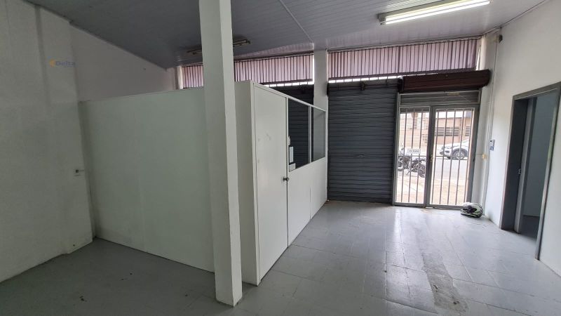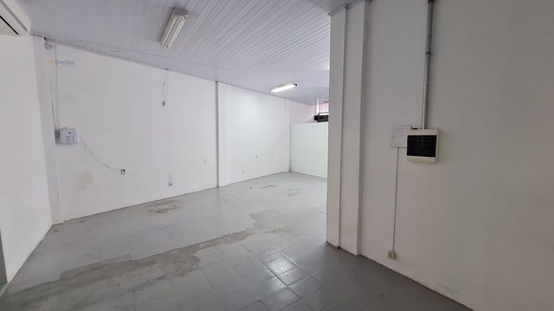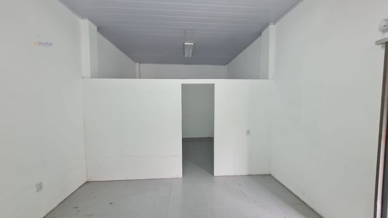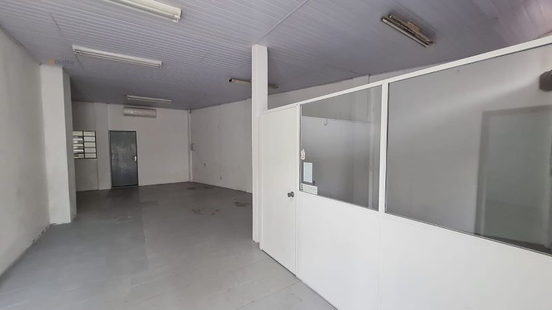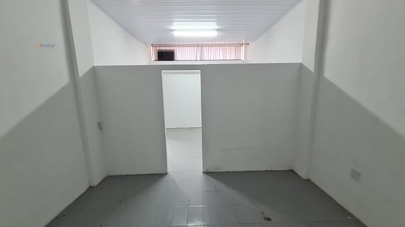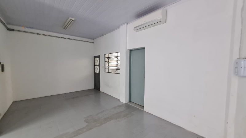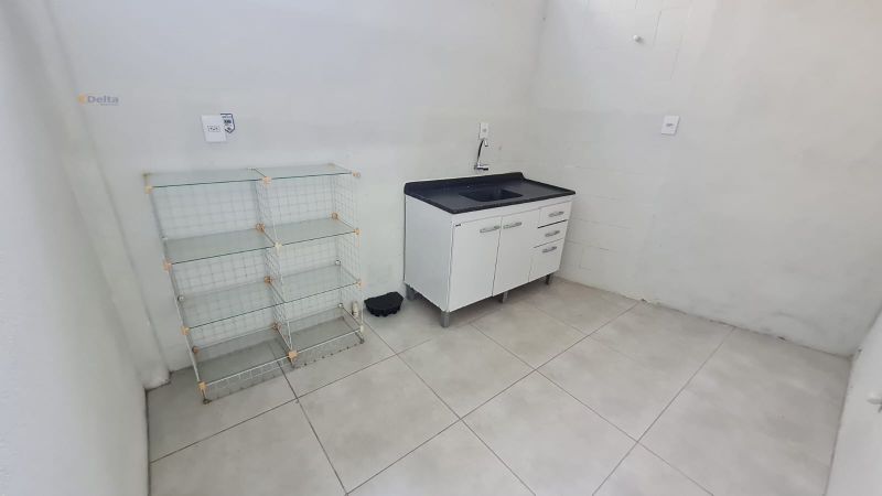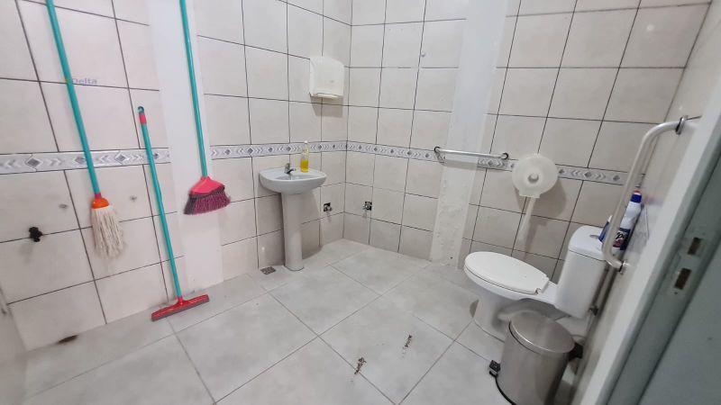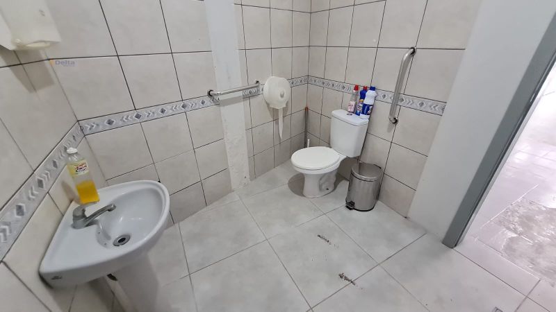 Sala comercial com 1 banheiro, ar-condicionado, divisórias internas e pia com torneira.